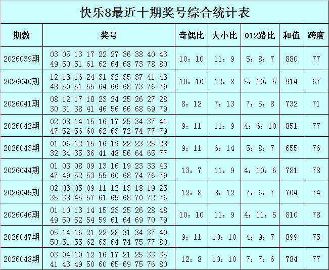 福彩惬心8第2026048期开出奖号:03 04 10 12 16 17 21 25 33 35 41 43 49 50 60 65 69 75 76 80,其中奖号奇偶比开出12:8,大小比开出10:10,和值开出784,跨度开出77,012路比开出7:7:6。