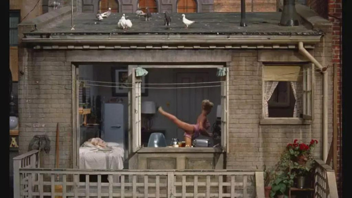 希区柯克的连环画形成了什么后果呢?院子里的东谈主物包括一双蜜月期的妻子(细君欲求活气,总把丈夫拉上床——这是1954年好莱坞导演相通使用的一个笑料)、别称女性先锋雕饰家,和一位渴慕爱情的「寂寥芳心姑娘」(朱迪斯·伊夫林饰)。