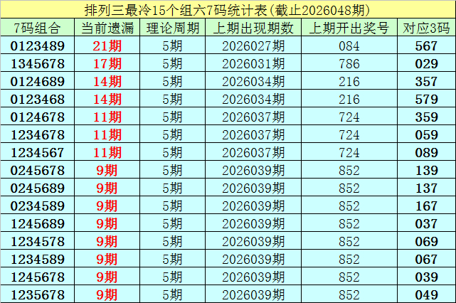 (1)在摆设三已开出的7523期奖号中(统计截至第2026048期),当今7码组六遗漏值最大的组合为:0123489,本期遗漏21期;