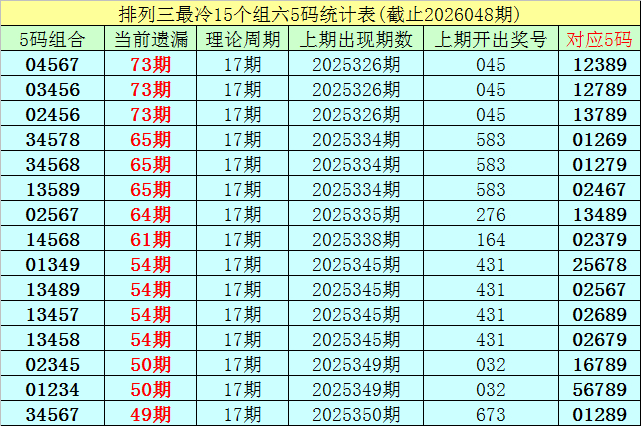 (5)摆设三当今遗漏值最大的5码组六组合为:04567、03456、02456,乐鱼体育官方网站本期遗漏73期,本期这3个五码解冻的可能性较小,则对应五码中可能齐会开出奖号。