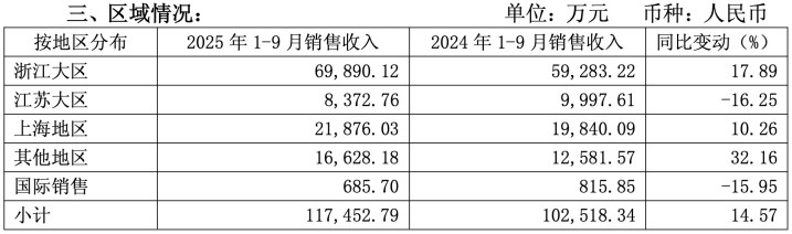 与此同期,乐鱼体育公司传统黄酒业务面对削弱压力。2025年第三季度,正常黄酒收入同比下落42.2%。从区域结构看,会稽山的销售仍高度围聚于江浙沪地区。2025年前三季度,浙江、江苏、上海三地所有孝顺了约83%的国内营收,其中浙江单一商场占比接近60%。