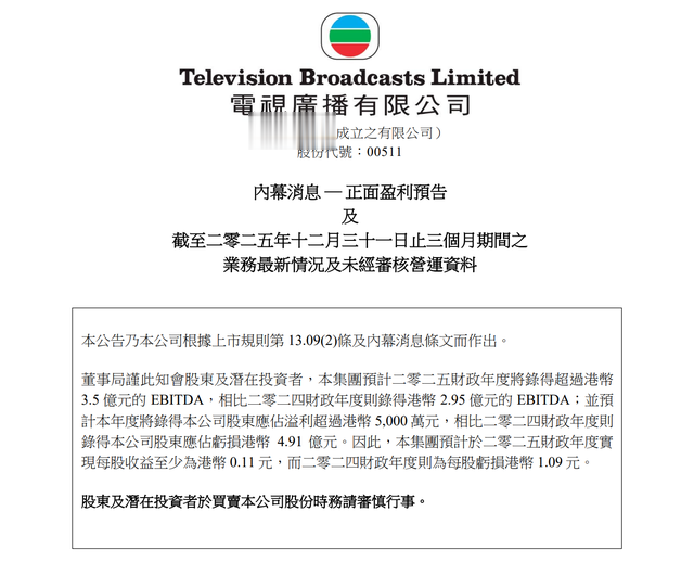 {jz:field.toptypename/}近日,电视播送有限公司(简称:电视播送;英文简称:TVB;000511.HK)发布事迹盈利预报,展望2025财年盈利跳跃5000万港元,同比扭亏为盈,2024年财年公司失掉4.91亿港元。公司展望2025财年EBITDA(息税折旧及摊销前利润)超3.5亿港元,2024财年为2.95亿港元;已毕每股收益至少0.11港元,2024年财年每股失掉1.09港元。