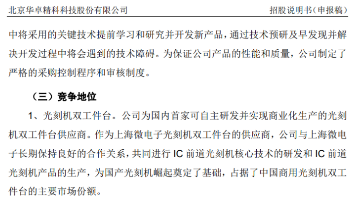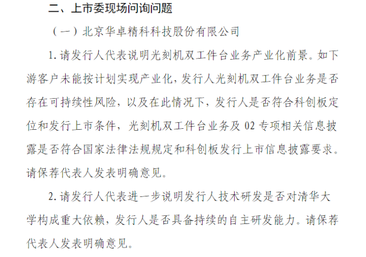 在现场问询中,上市委要求公司证明光刻机双工件台的产业化远景、技巧研发是否依赖清华大学等事项;并进一步证明在光刻机双工件台尚未结束产业化的情况下,公司主要业务是否稳当科创板定位和刊行上市条款。之后,华卓精科在招股书(上会稿)中透露,公司的纳米精度畅通及测控系统臆测技巧开发业务客户迥殊单一,现在唯一上海微电子一家,况且国内也唯一上海微电子有该类采购需求。