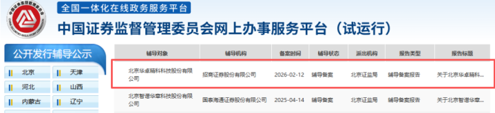中国证监会网站透露,北京华卓精科科技股份有限公司(简称“华卓精科”)于2月12日在北京证监局办理相易备案登记,拟初次公开刊行股票并上市,相易券商为招商证券。