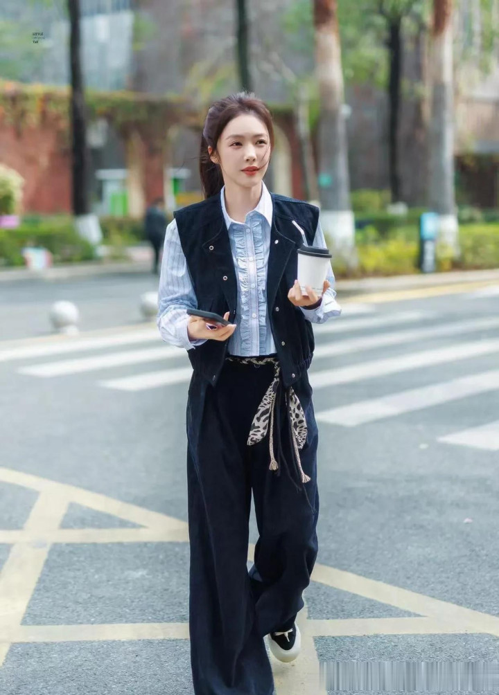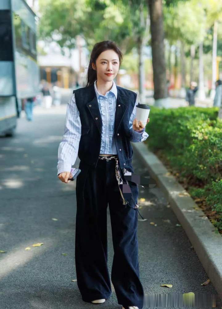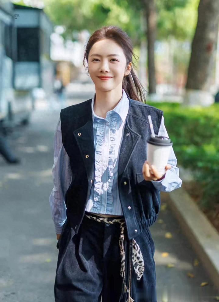 乐鱼 蔡爱静私服穿搭真文明! 蓝衬衫+马甲+牛仔裤, 减龄又高等!