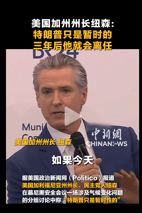 据澎湃新闻,当地期间2月13日,好意思国加州州长纽森在第62届慕尼黑安全会议分组相关中称,特朗普仅仅一位“过客”,三年后会离任的。