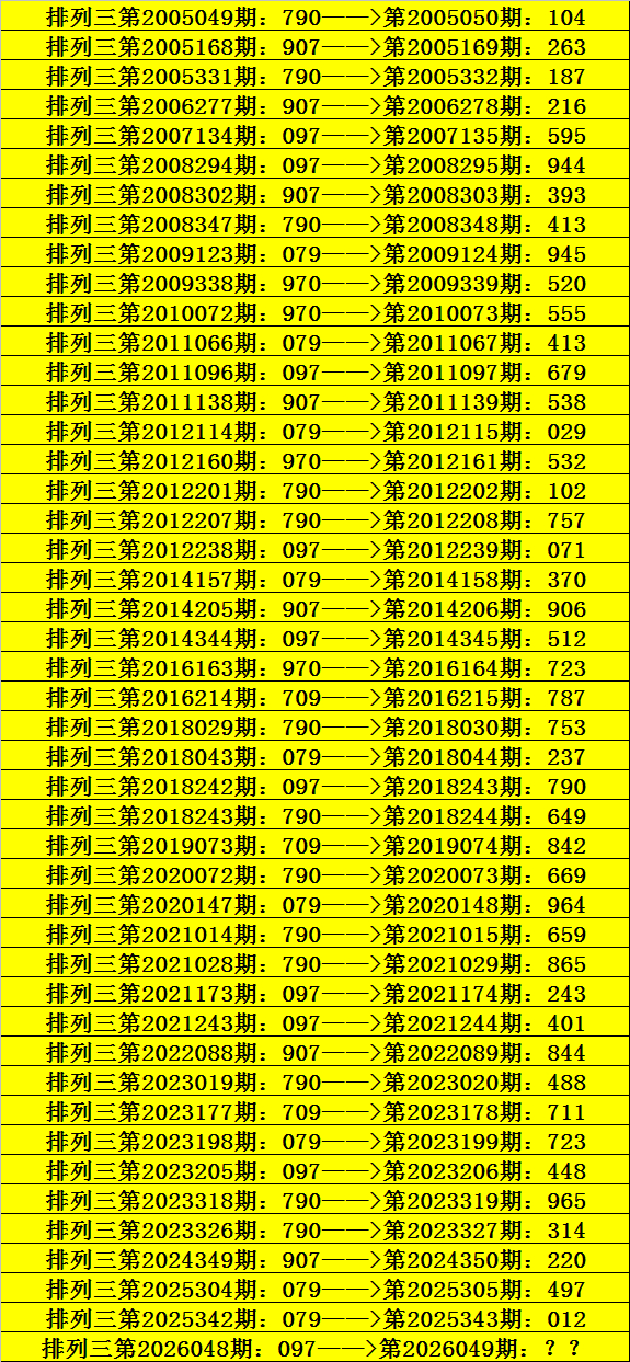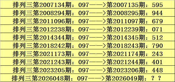 第2026048期胪列三奖号为097,历史上该号码直选出现10次,下期奖号分散为:595、944、679、071、512、790、243、401、448。