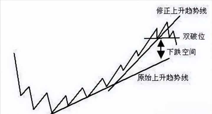 (3)双破位下落空间大小与原始上升趋势线的位置预计。