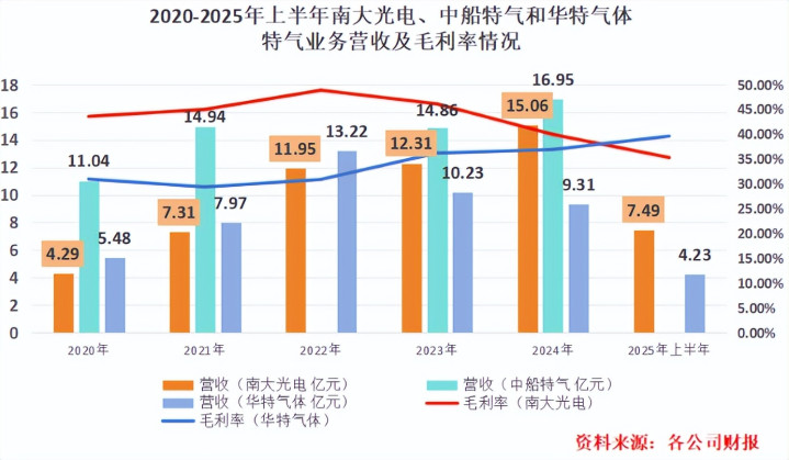 南大光电看准了这一关键赛说念,近几年一直加快发展:电子特气业务限度从2020年的4.29亿元擢升到2024年的15.06亿元,确切与中船特气“打了平手”,居品毛利率也在35%以上,位于行业较高区间。
