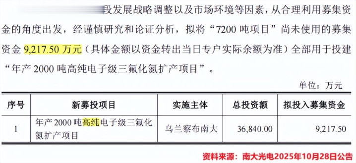 2025年10月28日,南大光电公告称,拟将原募投的“7200吨电子级三氟化氮格式”的未使用资金悉数插足“年产2000吨高纯电子级三氟化氮扩产格式”,共计金额9217.5万元。