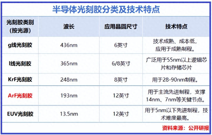 光刻胶曝光光源波长越短、时间难度越高。ArF光刻胶波长惟有193nm,可复旧14nm、7nm等关键节点,是除了EUV光刻胶之外时间难度最高的光刻胶。据统计,现在我国ArF光刻胶举座国产化率还不及1%。