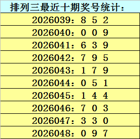 上期总结:摆列三第2026048期开奖号码为097,历史上组选出现46次,直选出现10次。